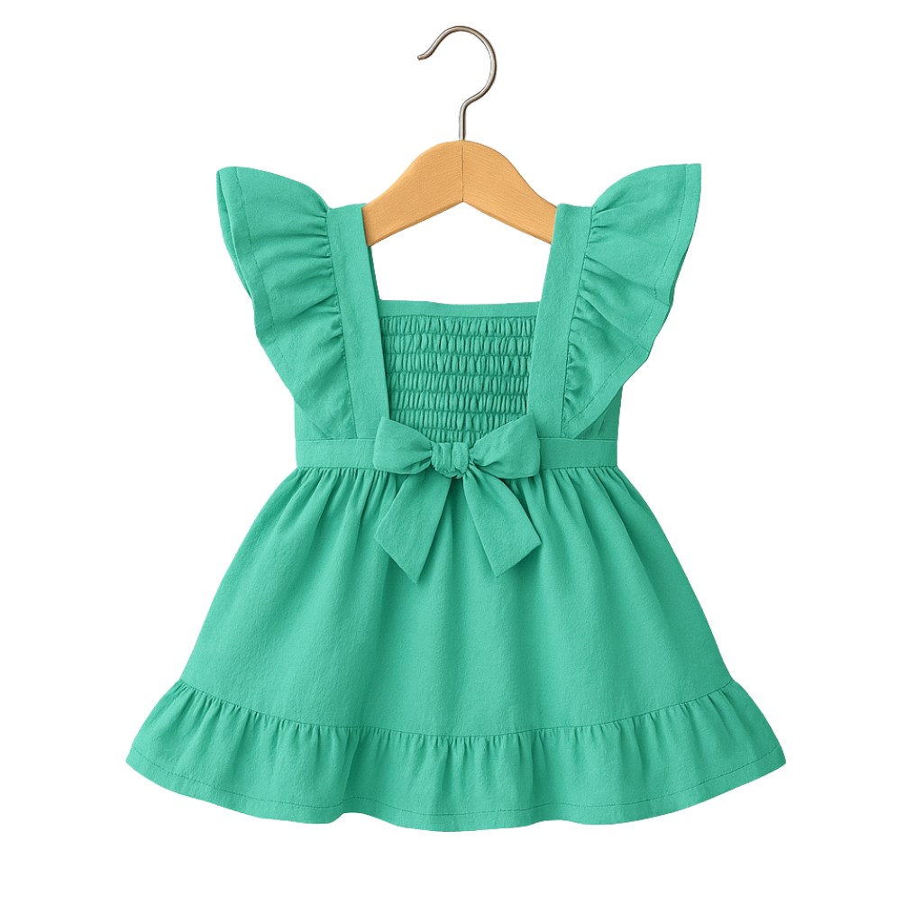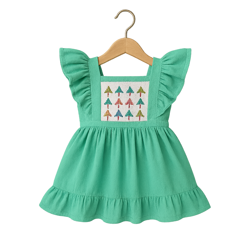 A charming and cheerful mint green baby dress with playful ruffle sleeves and a unique embroidered panel on the chest featuring a delightful pattern of small, colorful trees or mushrooms.