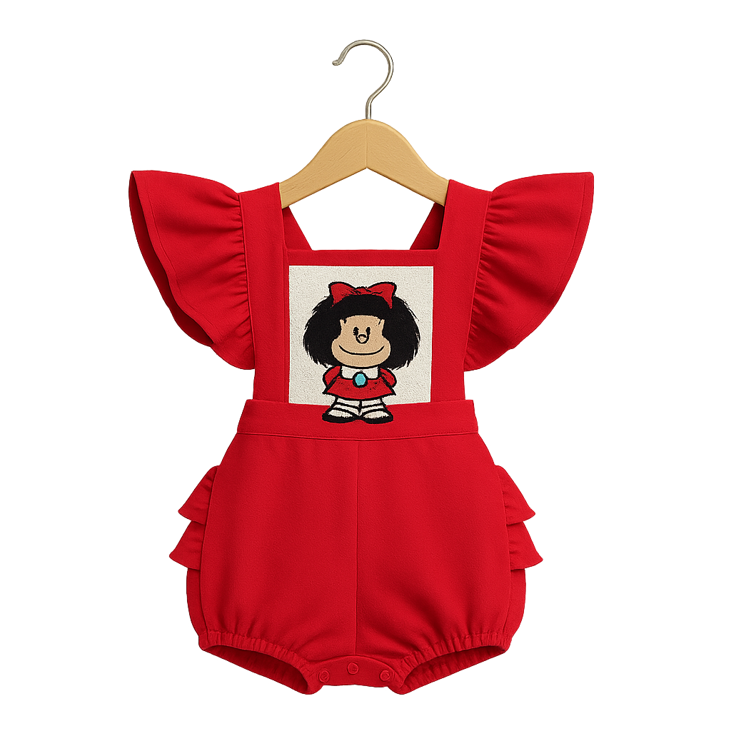A charming red baby jumper featuring playful ruffles on the sleeves and sides. The standout detail is a delightful patch on the chest with a beloved character in a red dress and bow.